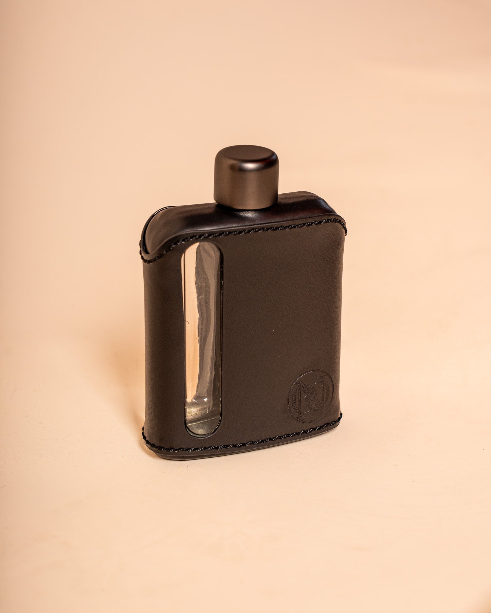 A sleek, compact flask made from thick glass and wrapped in supple black genuine leather for durability and style. The leather is subtly embossed with the Order of Nancy seal in the lower right corner. The Formal Flask holds 100 ml and includes a funnel, spare lid, and silicone lid liner.